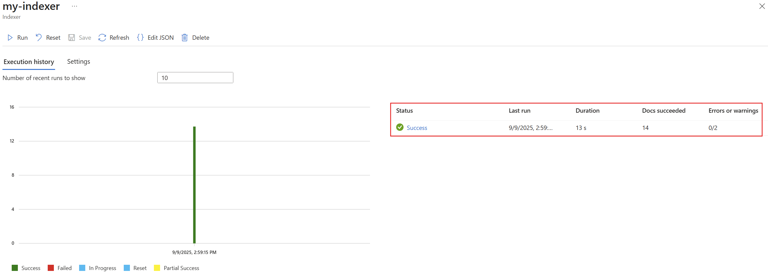 Select your index from the list. If the index has zero documents or storage, wait for the Azure portal to refresh.