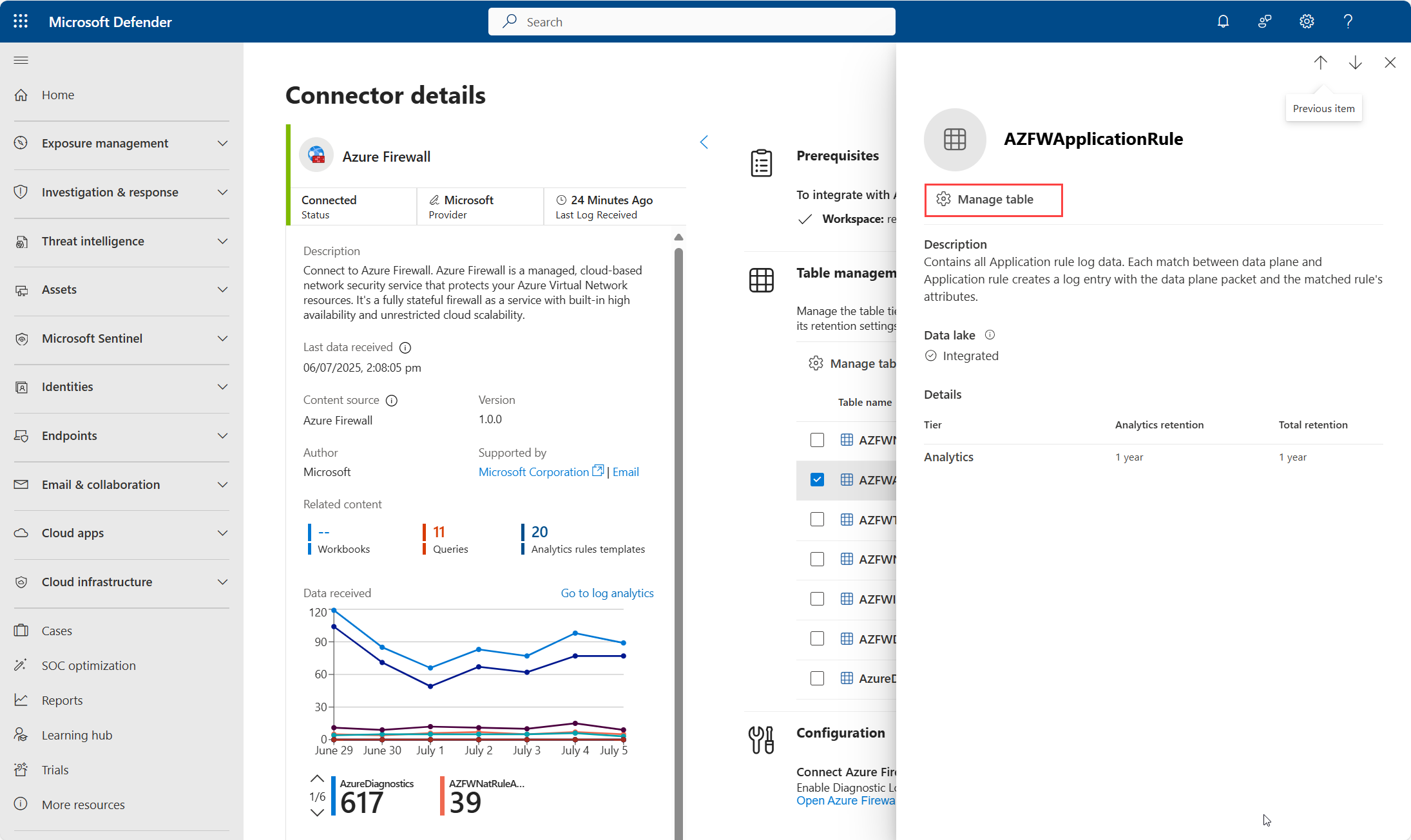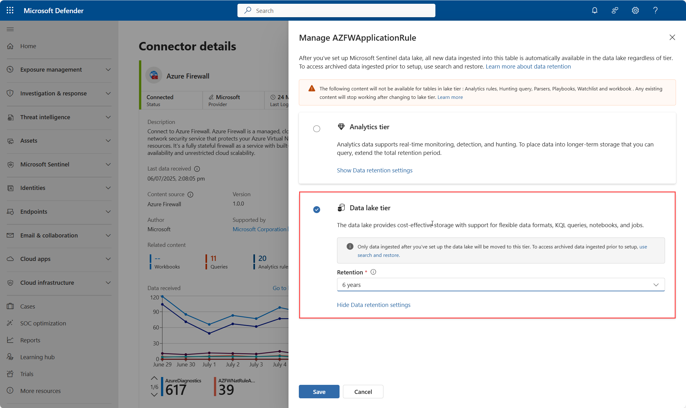 When you enable a connector, by default the data is sent to the analytics tier and mirrored in the data lake tier. Configure data retention in each tier or send the data only to the data lake tier. Retention and tiering are managed from the connector setup pages, or using the Table management page in the Defender portal. For more information on table management and retention, see Manage data tiers and retention in Microsoft Defender Portal.
