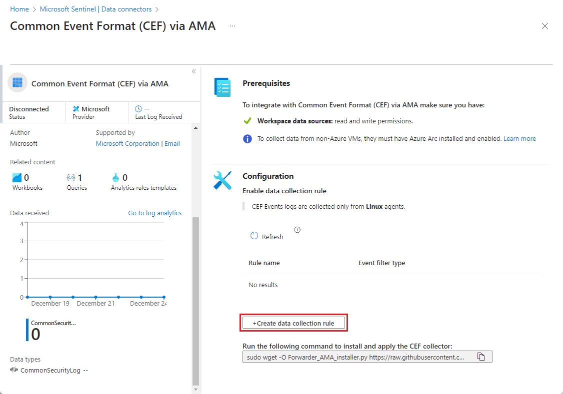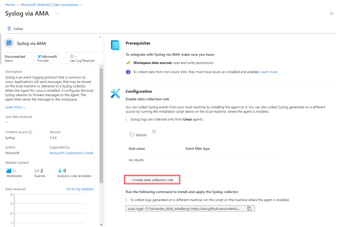 To get started, open either the Syslog via AMA or Common Event Format (CEF) via AMA data connector in Microsoft Sentinel and create a data collection rule (DCR).