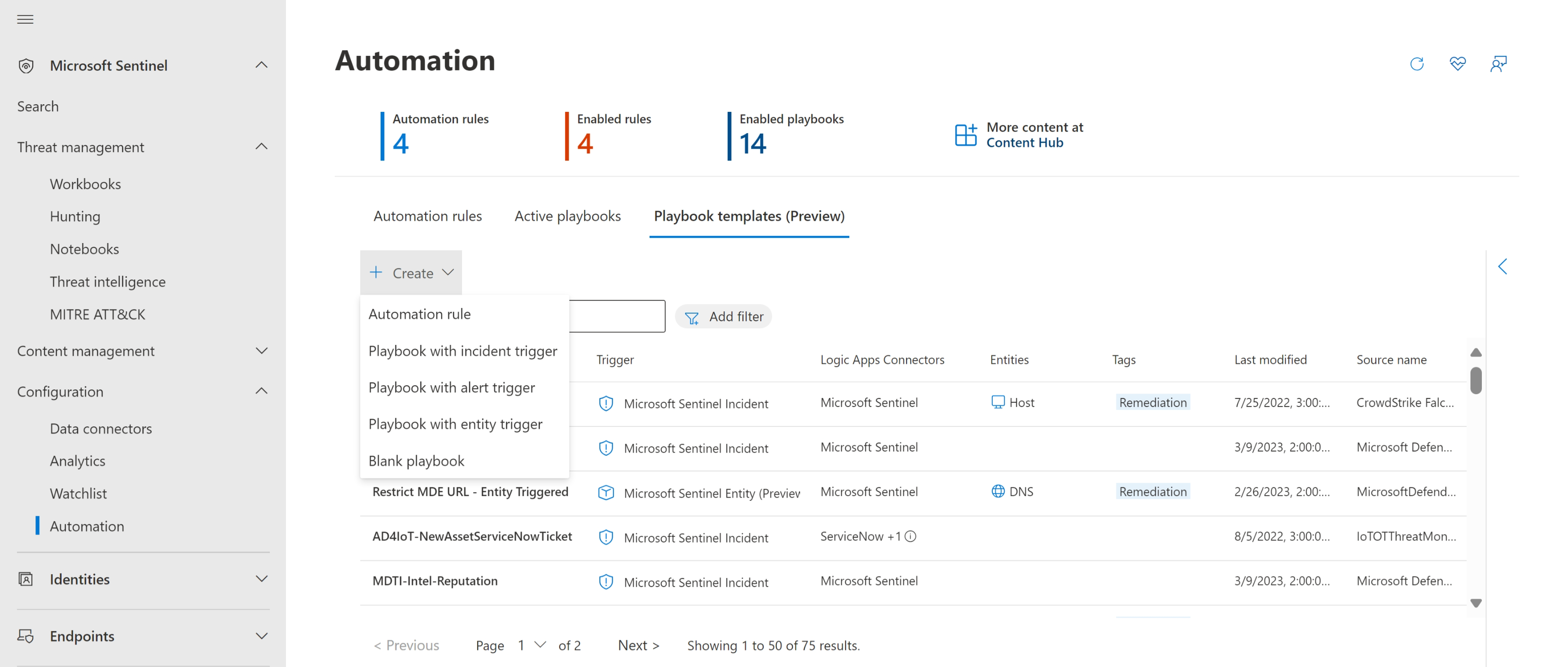 For Microsoft Sentinel in the Azure portal, select the Configuration > Automation page. For Microsoft Sentinel in the Defender portal, select Microsoft Sentinel > Configuration > Automation.