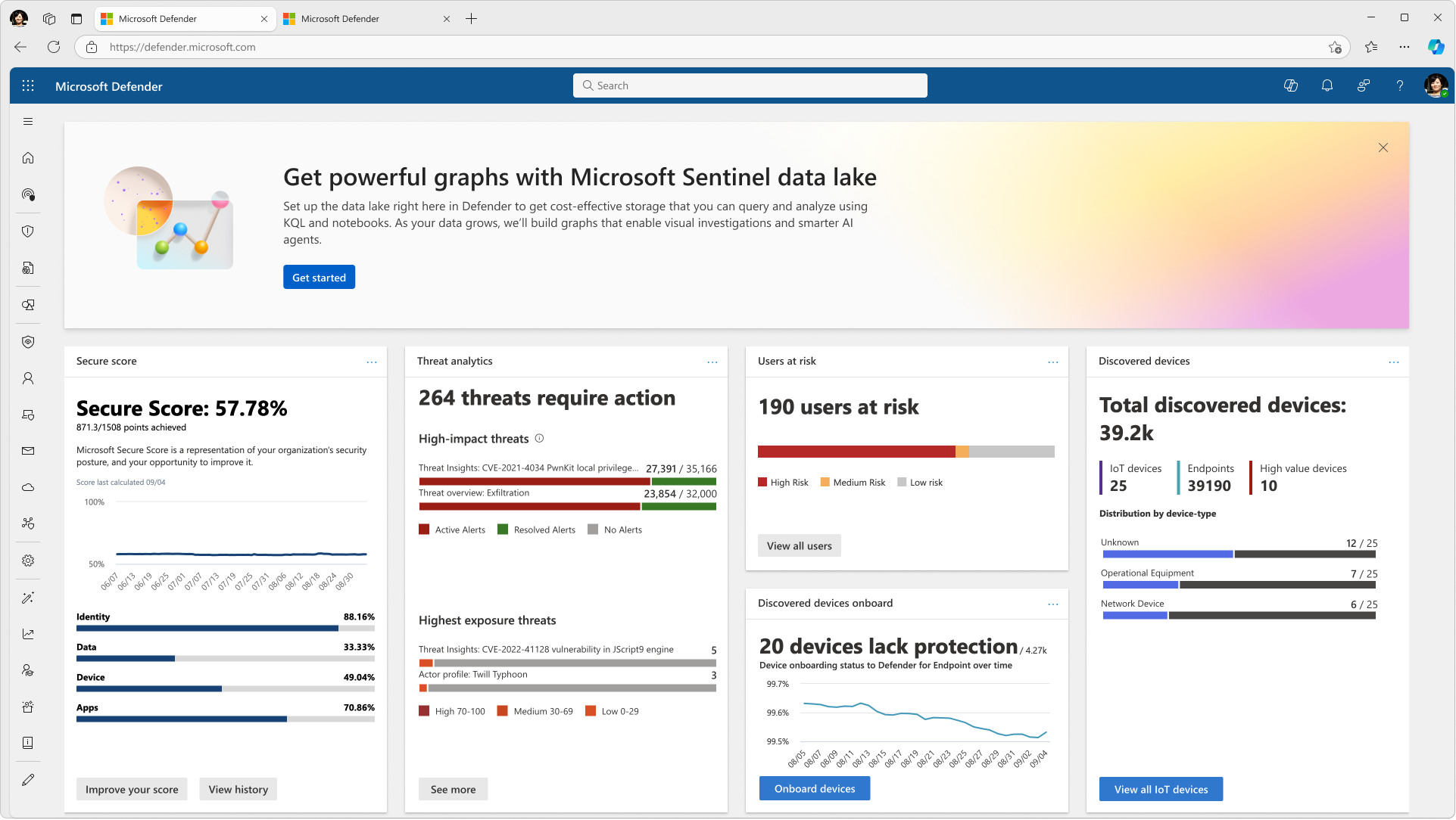 Once the onboarding process is complete, a new banner is shown containing information cards on how to start using the new data lake experiences. For example, select Hunt for latent threats with graphs to open a threat hunting experience that employs interactive graphs to proactively find threats and sources of risk. Select Query data lake to open the data lake exploration KQL queries editor. KQL queries are a new feature in the Defender portal that allows you to explore and analyze data in the Microsoft Sentinel data lake using KQL. For more information, see Data lake exploration, KQL queries.