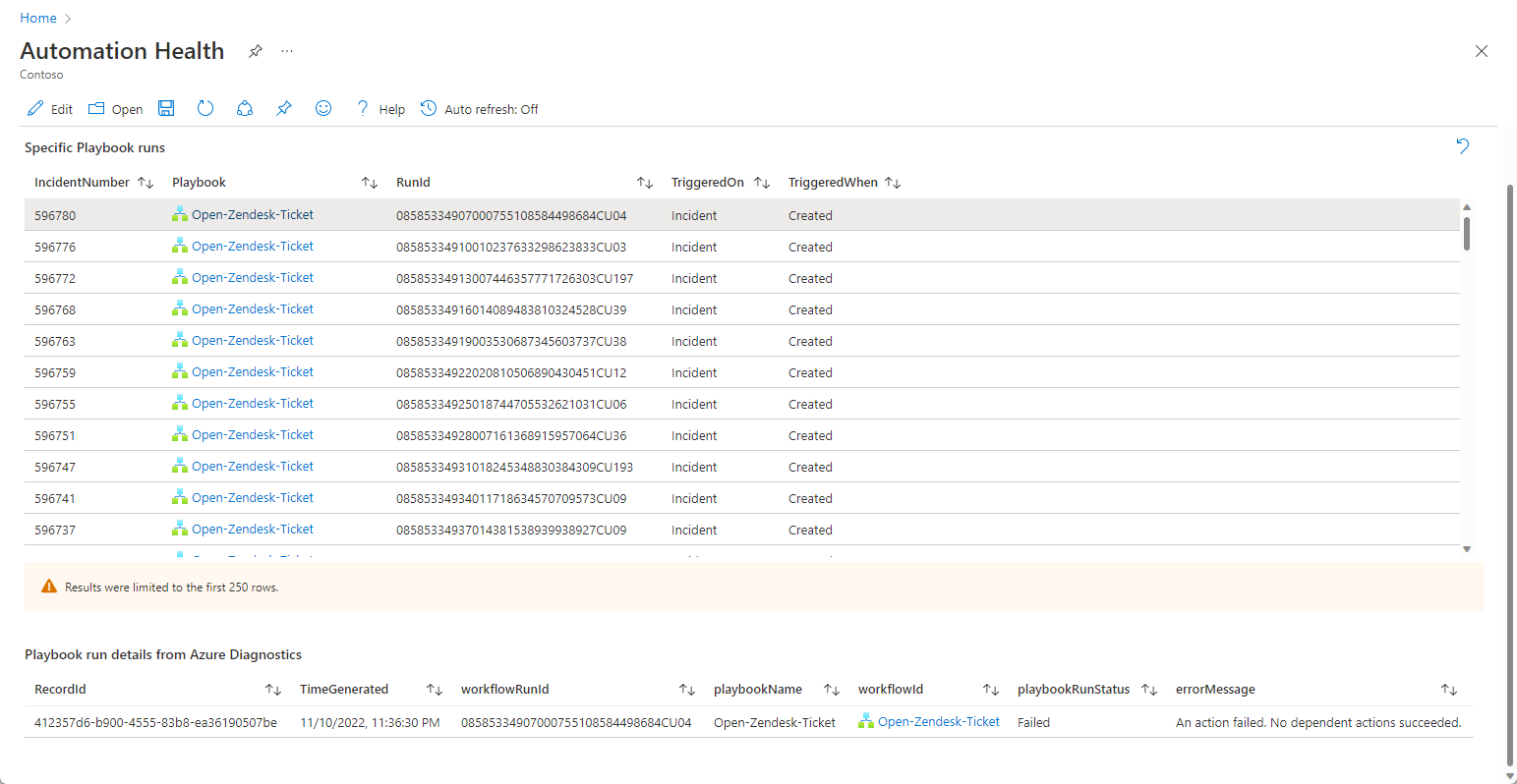 To ensure proper functioning and performance of your security orchestration, automation, and response operations in your Microsoft Sentinel service, keep track of the health of your automation rules and playbooks by monitoring their execution logs.
