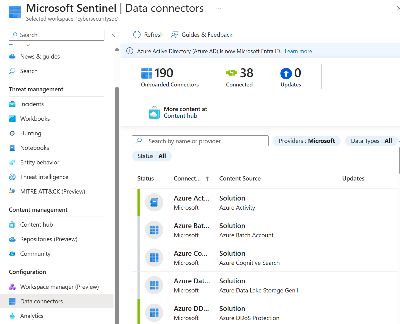 | Custom connectors | Microsoft Sentinel supports ingesting data from some sources without a dedicated connector. If you're unable to connect your data source to Microsoft Sentinel using an existing solution, create your own data source connector. | Resources for creating Microsoft Sentinel custom connectors. |