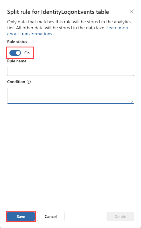Split transformations enable you to route data between the Analytics tier and the Data lake tier based on specified conditions. Use a split transformation rule to define a KQL expression that determines which data lands in Analytics. Data that doesn't match the expression is routed to the Data lake tier only.