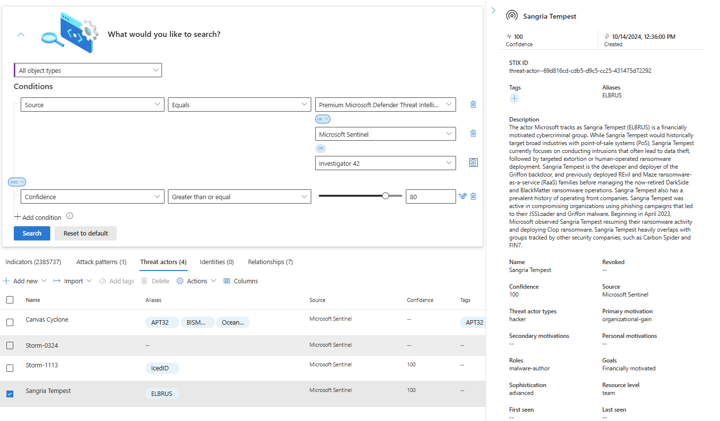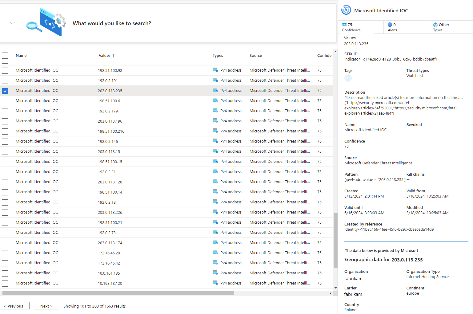 Use the management interface to sort, filter, and search your threat intelligence from whatever source they were ingested from without writing a Log Analytics query.