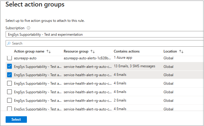 Use the Actions tab to select from existing groups, or create new action groups to set up the actions you want to happen with the alert triggers. For more information, see Action groups.