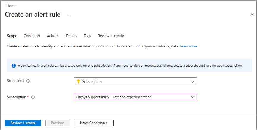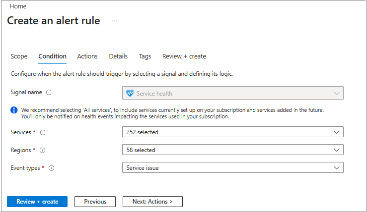 On the Condition tab, you configure when the alert rule should trigger by setting up the services, regions, and event types.