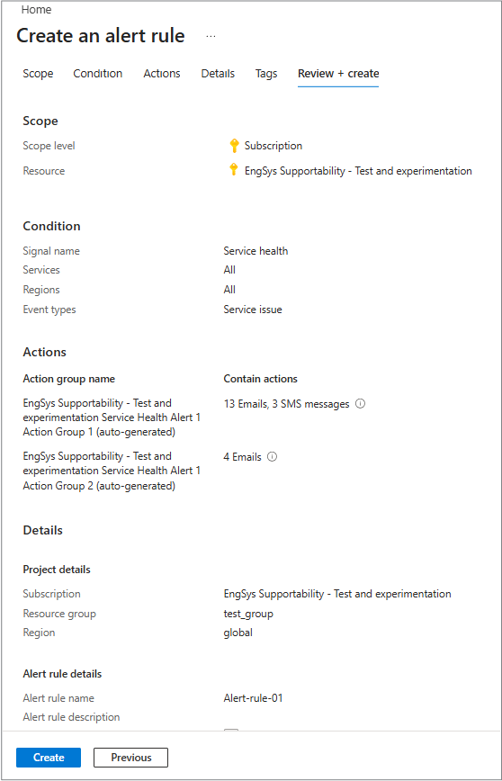 - Select Create to finish the alert. If you want to add more detailed information for the service health alert, select Advanced Options to add more information to your alert.