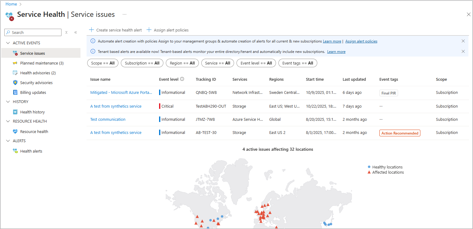 Azure offers a suite of experiences to keep you informed about the health of your cloud resources. This information includes current and upcoming issues such as service impacting events, planned maintenance, and other changes that might affect your availability.