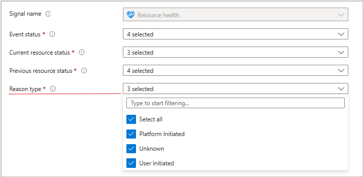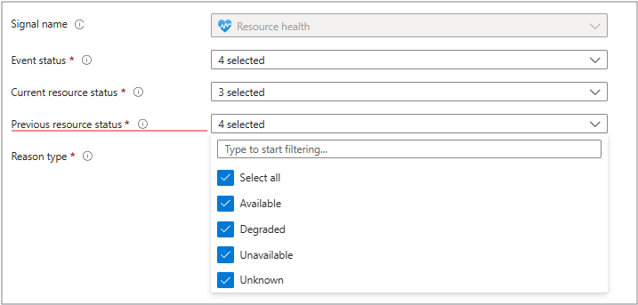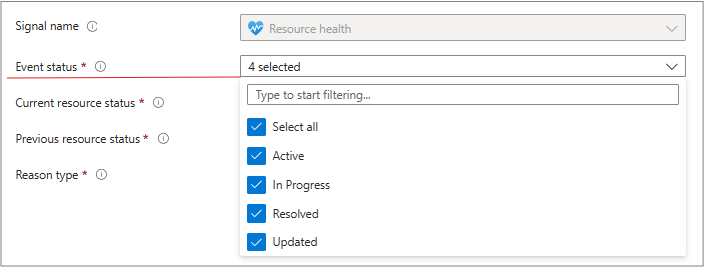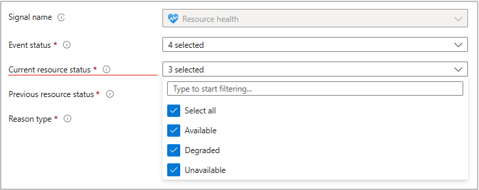 Use this tab to choose what triggers your alert. Set it to watch for changes in resource health status (Unavailable or Degraded), event status (Active or Resolved), or specific reason types (platform vs. user actions).
