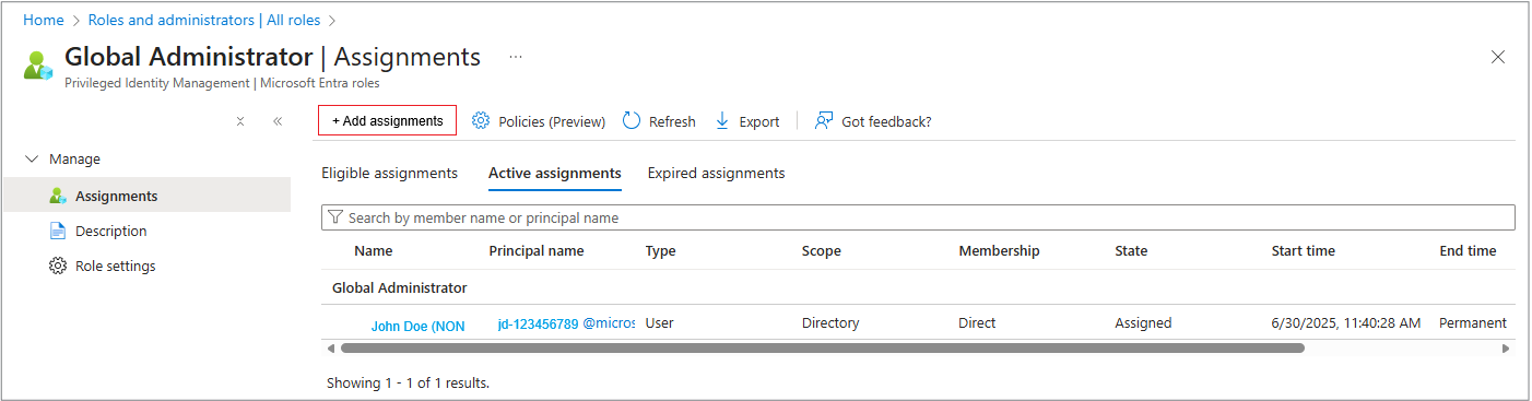 - The user/group/app appears under the role's Assignments tab.