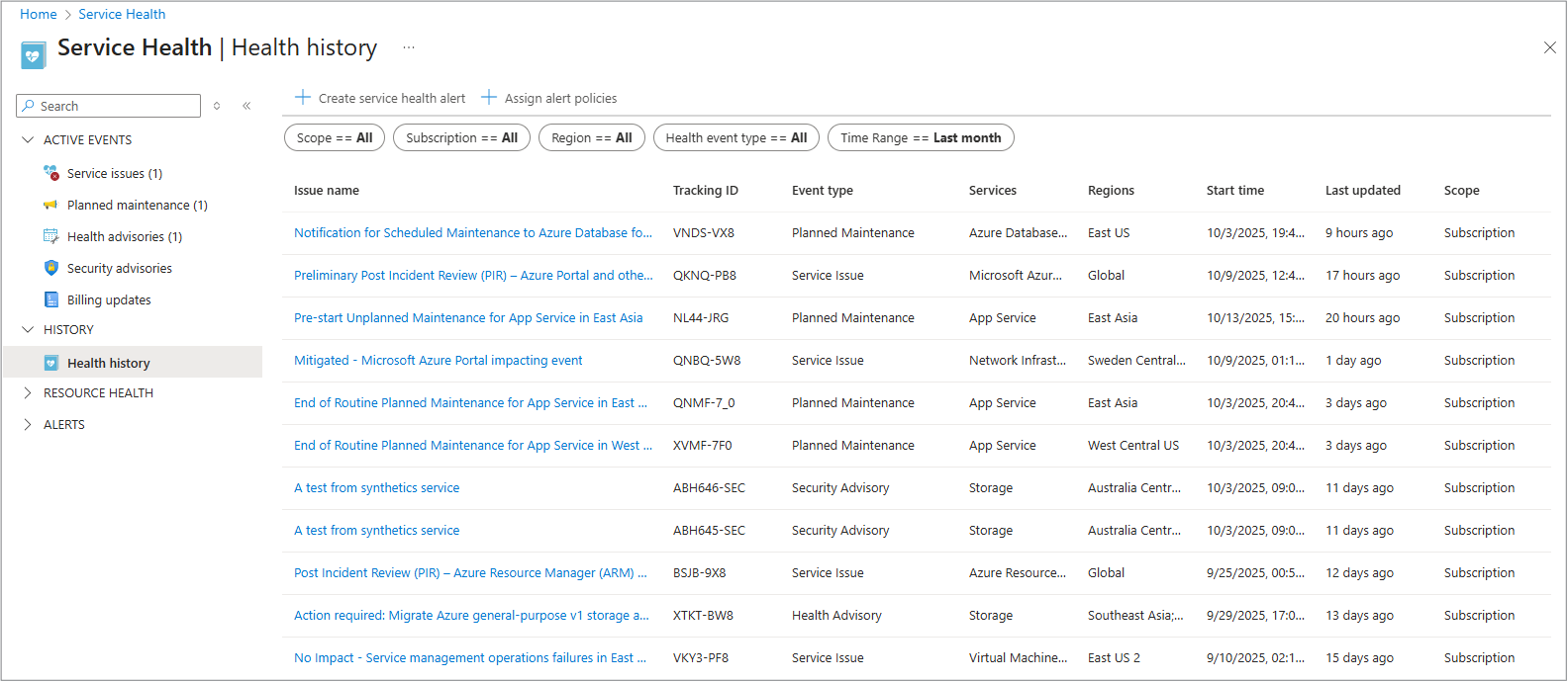Programmatic Access: Because these are Activity Log events, you can retrieve them using Azure’s APIs or command-line tools. Azure also provides Resource Graph queries to list service health events across resources. This programmatic access is helpful for integration with external systems or dashboards.