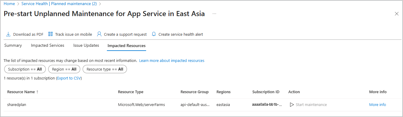 For more information about impacted resources, see Impacted Resources from Planned maintenance events.