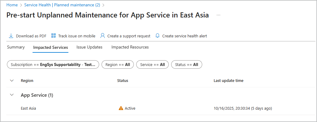 Service Health is designed to be the authoritative place for you to understand maintenance events, assess impact, and be redirected to take action where applicable. For some planned maintenance events, you see the full Service Health experience, which includes: