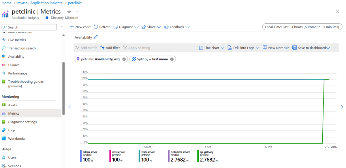 Test name URL Content must contain admin-serverhttps://<your-Azure-Spring-Apps-instance-name>-admin-server.azuremicroservices.io/actuator/health/livenessUPcustomers-servicehttps://<your-Azure-Spring-Apps-instance-name>-api-gateway.azuremicroservices.io/api/customer/actuator/health/livenessUPvets-servicehttps://<your-Azure-Spring-Apps-instance-name>-api-gateway.azuremicroservices.io/api/vet/actuator/health/livenessUPvisits-servicehttps://<your-Azure-Spring-Apps-instance-name>-api-gateway.azuremicroservices.io/api/visit/actuator/health/livenessUP