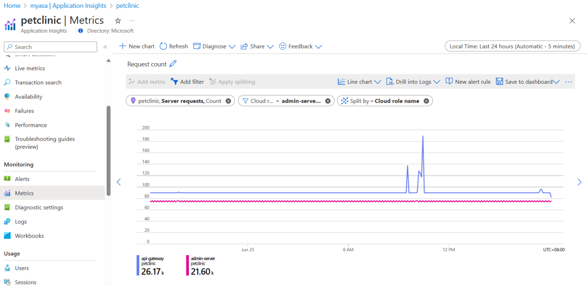 This section shows you how to use metrics with your application and monitor the metrics in an Azure dashboard using the key metrics charts generated by Azure Spring Apps and Application Insights.