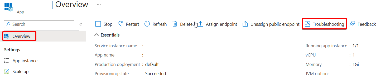 In the Azure portal, navigate to your target app, then select Troubleshooting.
