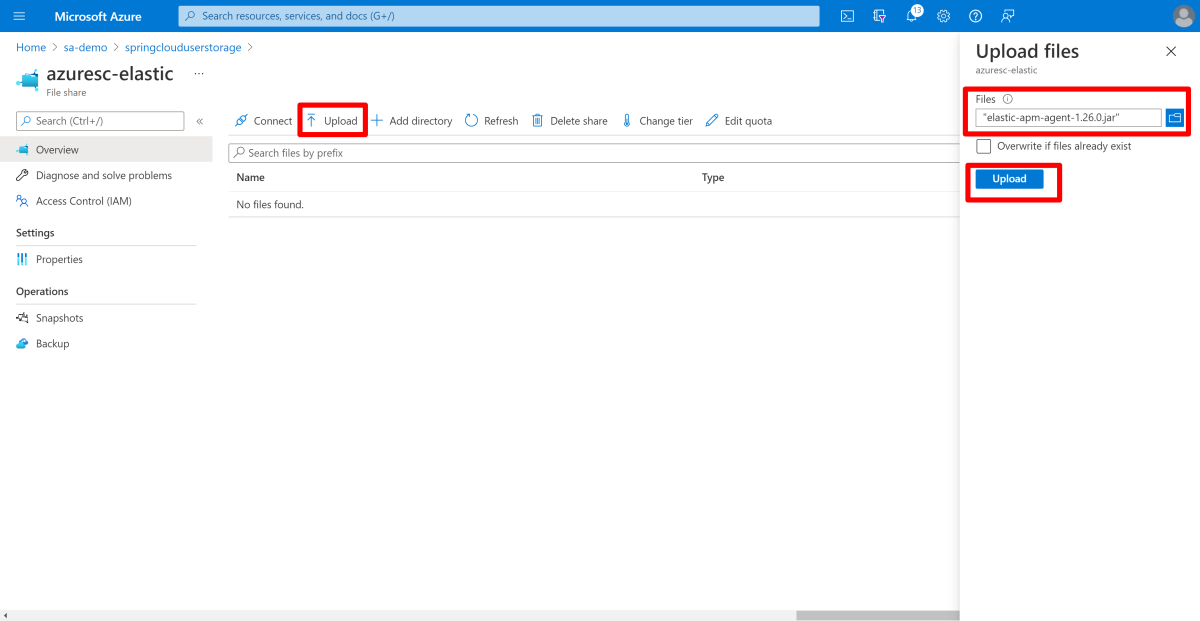 Upload Elastic APM Agent to the custom persistent storage you enabled earlier. Go to Azure Fileshare and select Upload to add the agent JAR file.