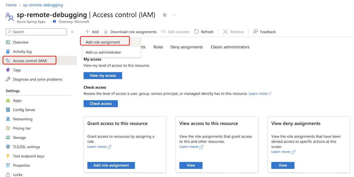 To remotely debug an app instance, you must be granted the role Azure Spring Apps Remote Debugging Role, which includes the Microsoft.AppPlatform/Spring/apps/deployments/remotedebugging/action data action permission.