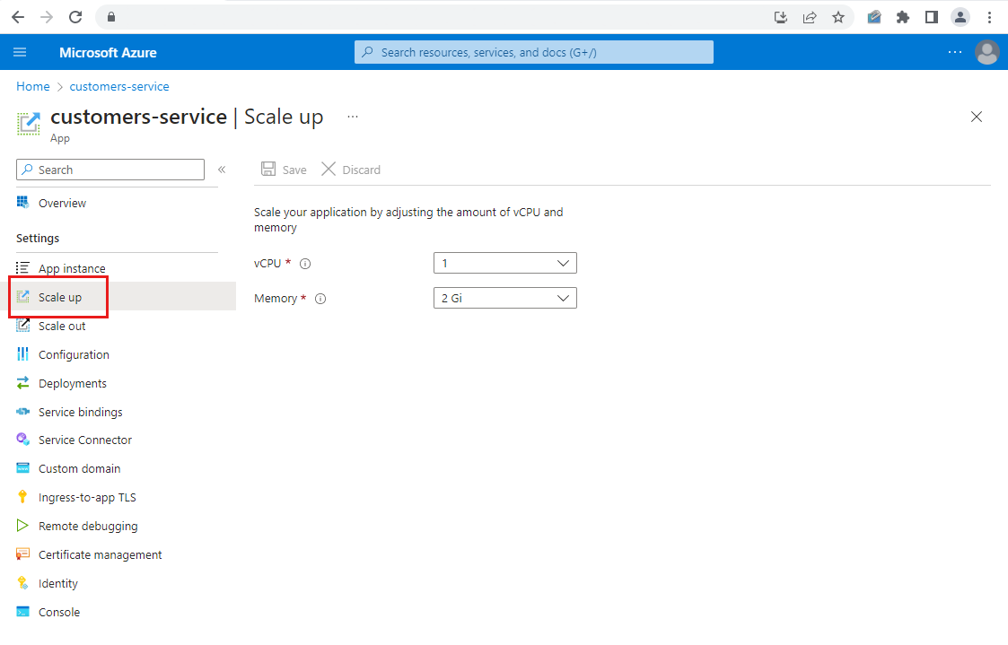 Select the app you want to scale and then select Scale up in the navigation pane. Specify the vCPU and Memory settings using the guidelines as described in the following section.