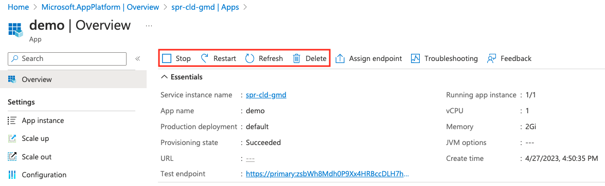 After you deploy an application, you can start, stop, and delete it by using the Azure portal or Azure CLI.