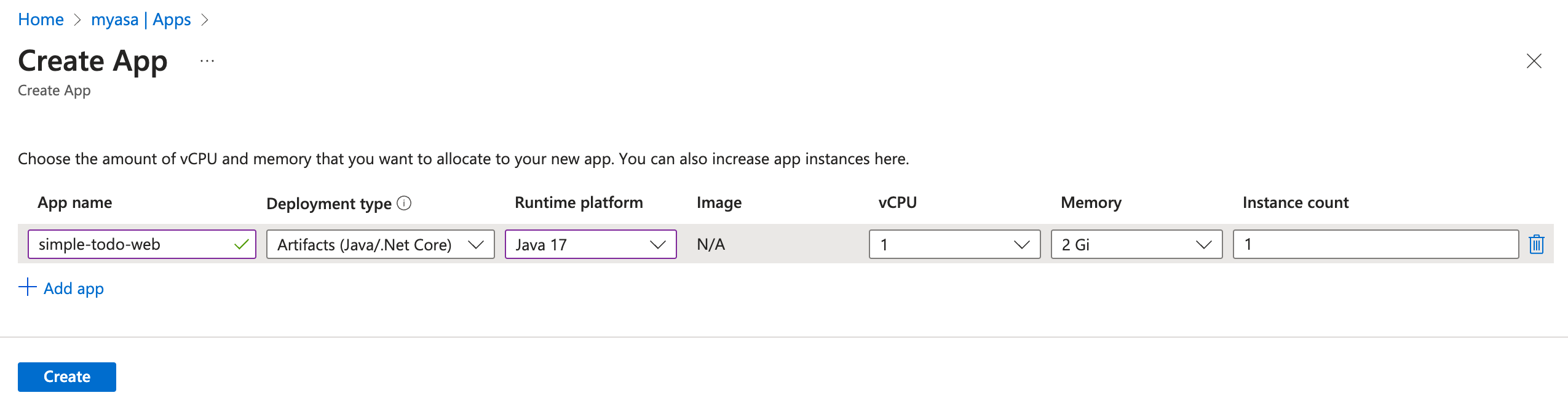 On the Create App page, for the app name, use simple-todo-web and for the runtime platform, select Java 17.