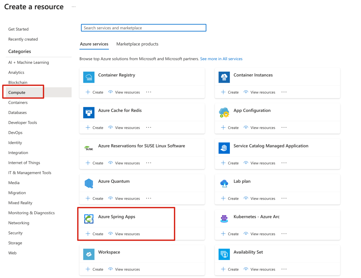 - The Azure portal option is the easiest and the fastest way to create resources and deploy applications with a single click. This option is suitable for Spring developers who want to quickly deploy applications to Azure cloud services.