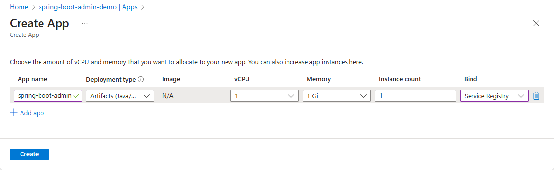 After you create the app, the next step is to build the Spring Boot Admin service app. Follow the instructions in the Spring Boot Admin Get Started documentation.