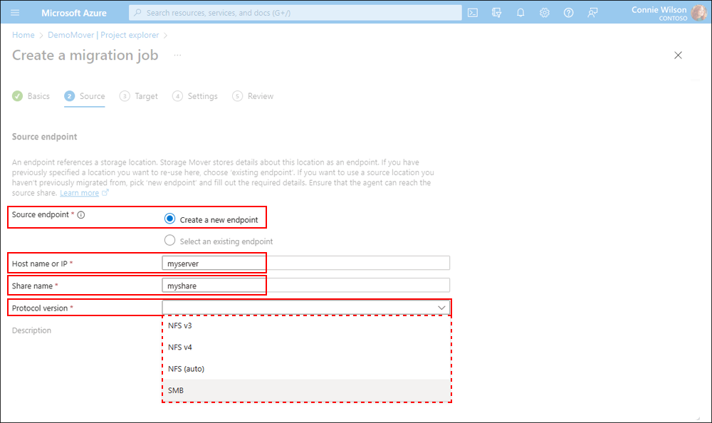 To define a new source endpoint from which to migrate your data, select the Create a new endpoint option. Next, provide values for the required Host name or IP, Share name, and Protocol version fields. You can also add an optional description value of less than 1024 characters.