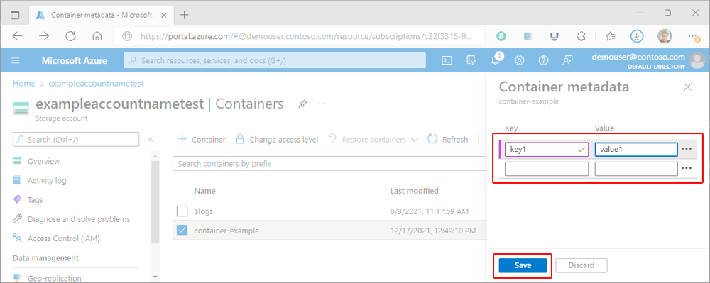 The Container metadata pane will display existing metadata key-value pairs. Existing data can be edited by selecting an existing key or value and overwriting the data. You can add additional metadata by and supplying data in the empty fields provided. Finally, select Save to commit your data.