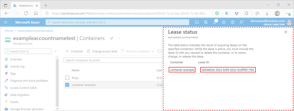 Select the container's More button (...), and select Acquire lease to request a new lease and display the details in the Lease status pane.