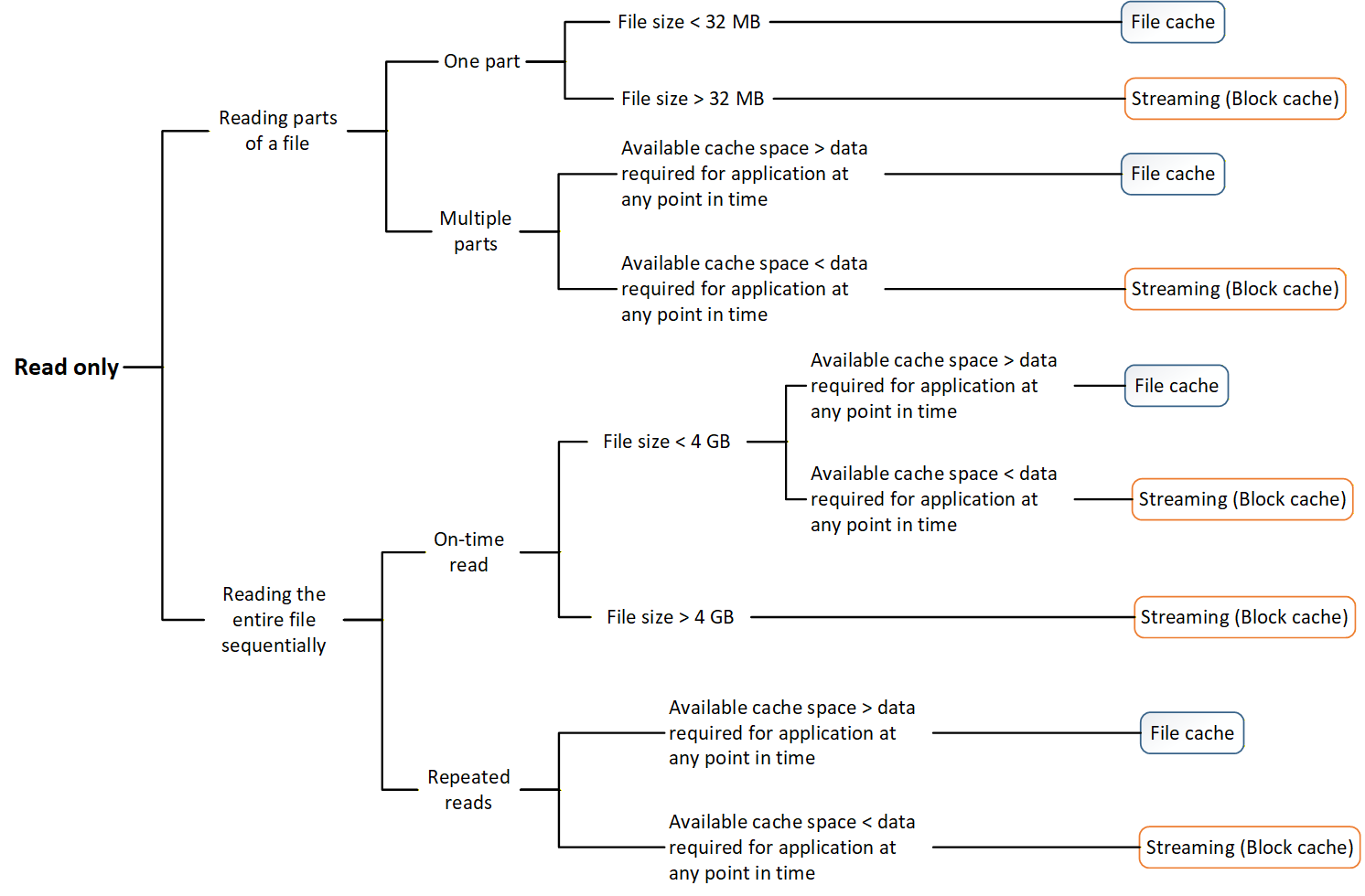 Use streaming mode for large files, as it supports streaming for both read and write operations. BlobFuse caches blocks of streaming files in memory. For smaller files that don't consist of blocks, the entire file is stored in memory. Caching mode is the alternative mode, which you should use for workloads that don't involve large files, where files are stored on disk in their entirety.