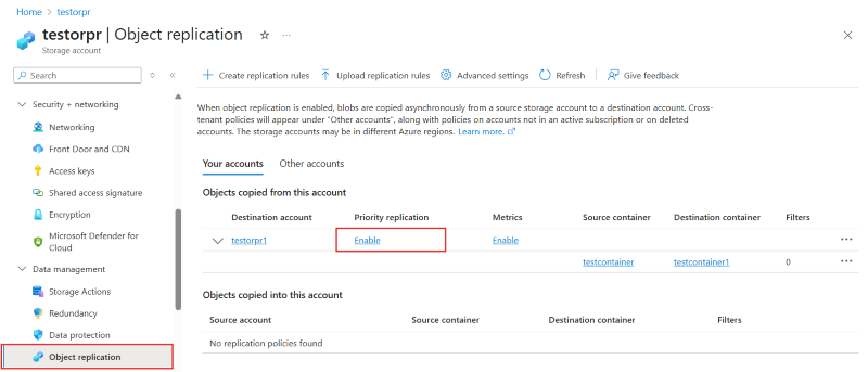 In the Azure portal, navigate to the storage account you want to modify. In the left navigation pane, expand the Data Management group and select Object replication. The Your accounts tab is selected by default, displaying all existing OR policies for the storage account.
