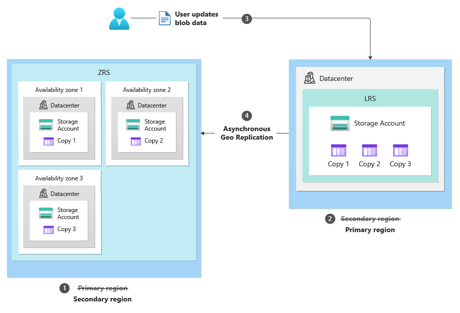 After the failback is complete, the storage account is restored to its original redundancy configuration. Users can resume writing data to the storage account in the original primary region (1) while replication to the original secondary (2) continues as before the failover: