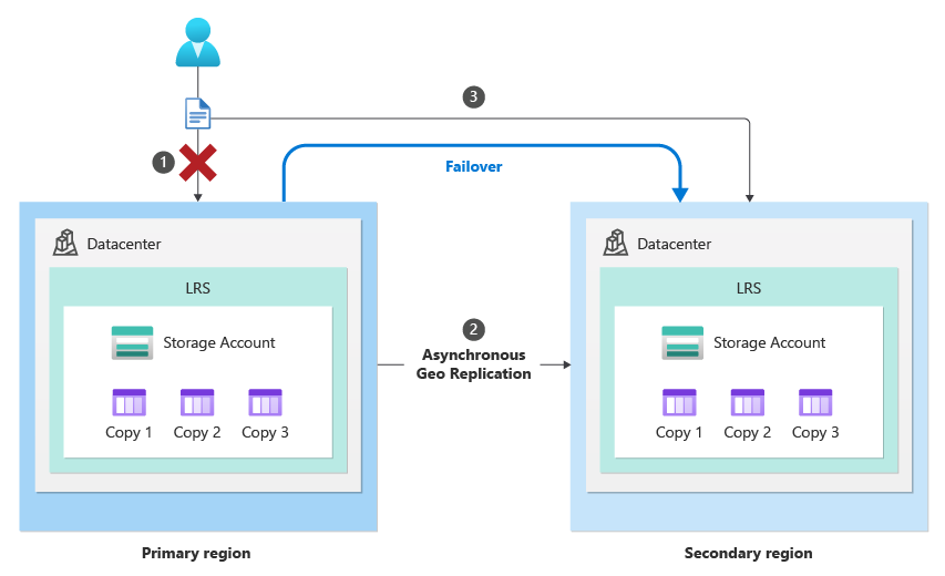 Under normal circumstances, a client writes data to a storage account in the primary region via storage service endpoints (1). The data is then copied asynchronously from the primary region to the secondary region (2). The following image shows the normal state of a storage account configured as GRS: