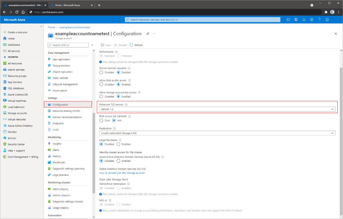 When you create a storage account with the Azure portal, the minimum TLS version is set to 1.2 by default.