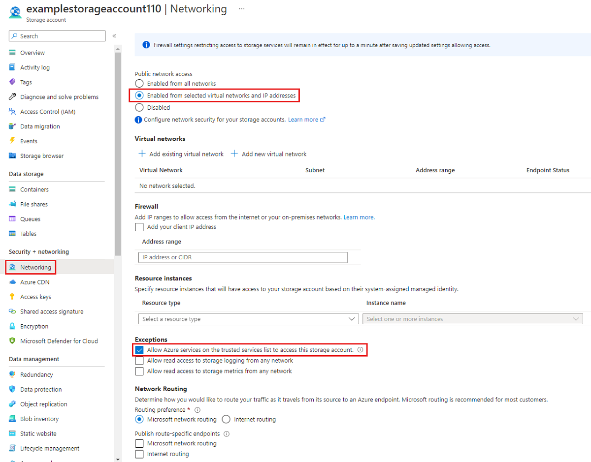 Grant access to trusted Azure services and restrict access to the storage account public endpoint to specific virtual networks