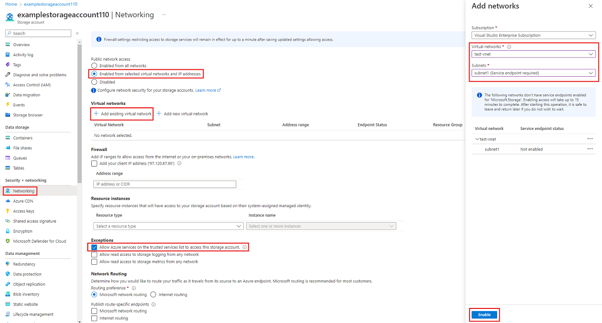 At the top of the page, select the Enabled from selected virtual networks and IP addresses radio button. This will un-hide a number of settings for controlling the restriction of the public endpoint. Select +Add existing virtual network to select the specific virtual network that should be allowed to access the storage account via the public endpoint. Select a virtual network and a subnet for that virtual network, and then select Enable.
