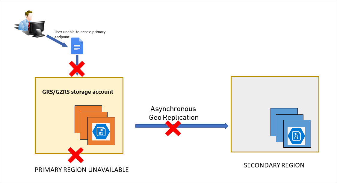 If the primary endpoint becomes unavailable for any reason, the client is no longer able to write to the storage account. The following image shows the scenario where the primary has become unavailable, but no recovery has happened yet: