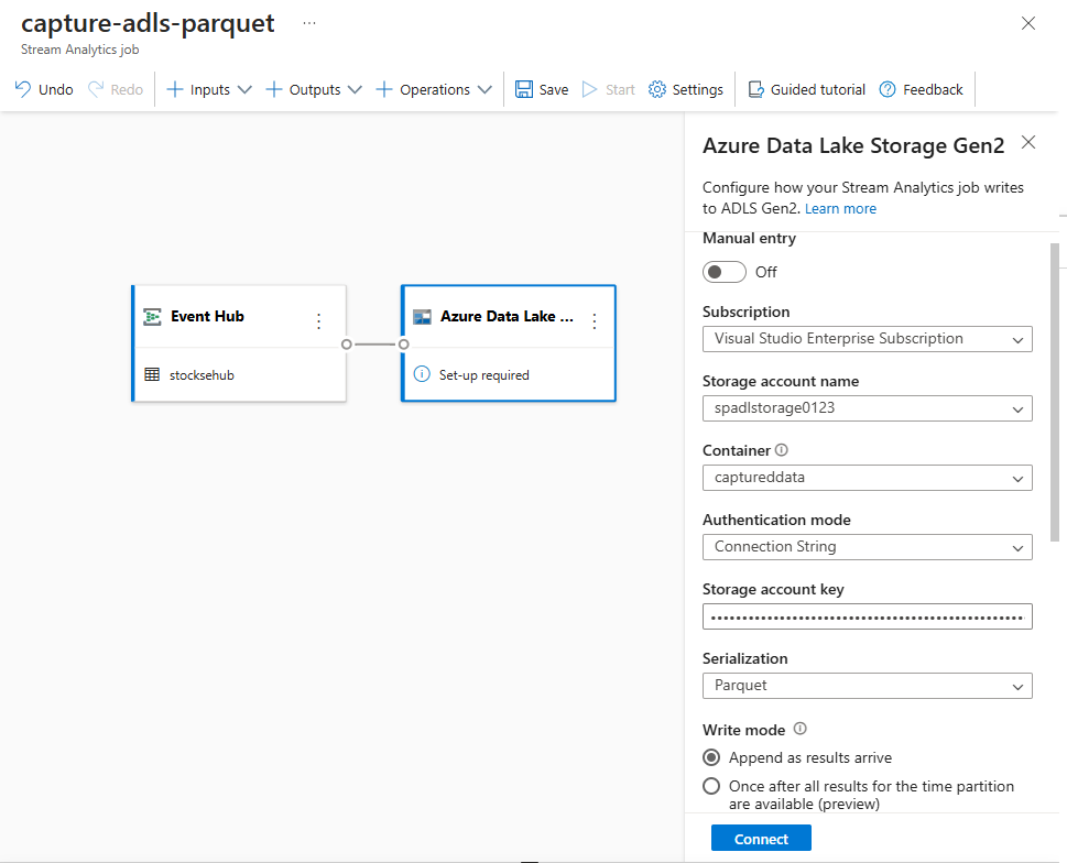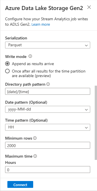 {date}. To learn about custom path patterns, see to Azure Stream Analytics custom blob output partitioning.Select Connect