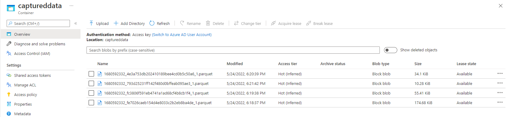 Verify that the Parquet files are generated in the Azure Data Lake Storage container.