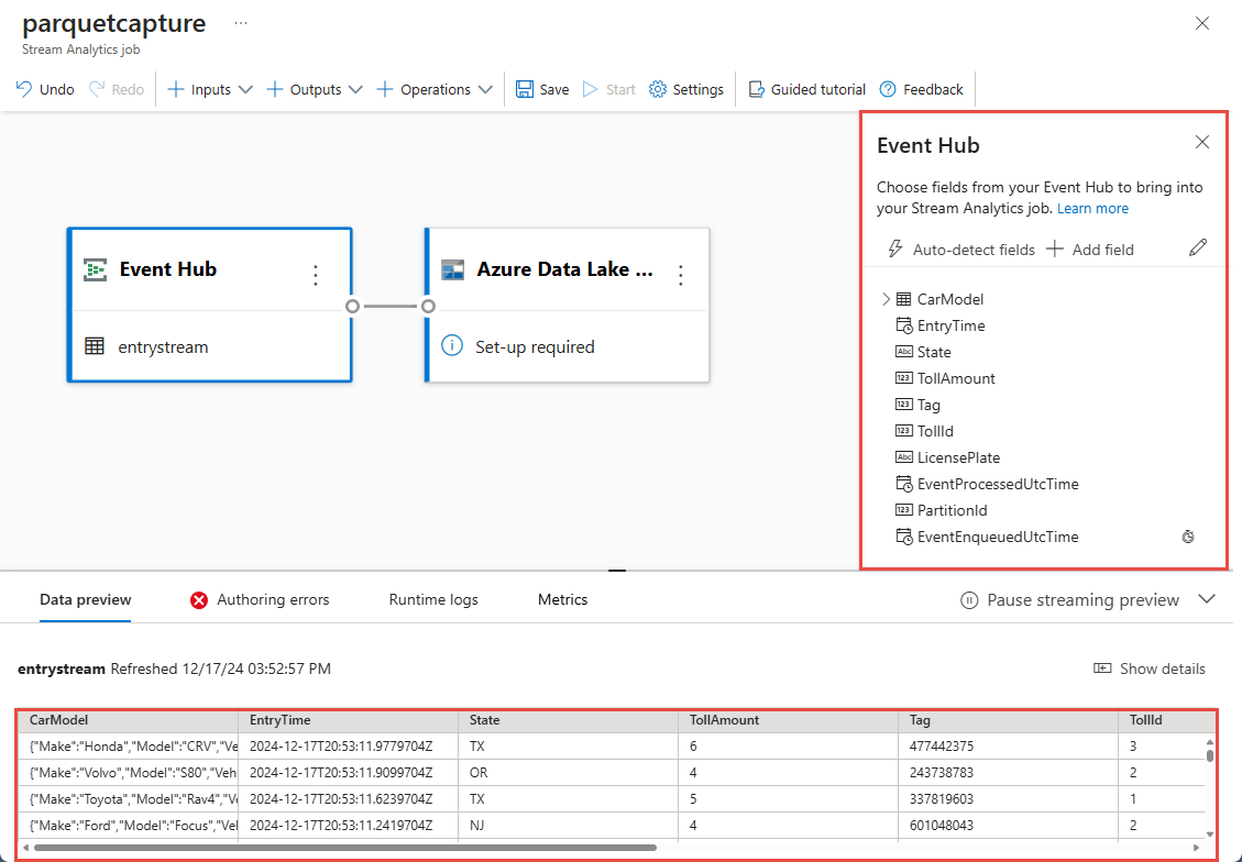 This tutorial shows you how to use the Stream Analytics no code editor to create a job that captures Event Hubs data in to Azure Data Lake Storage Gen2 in the parquet format.