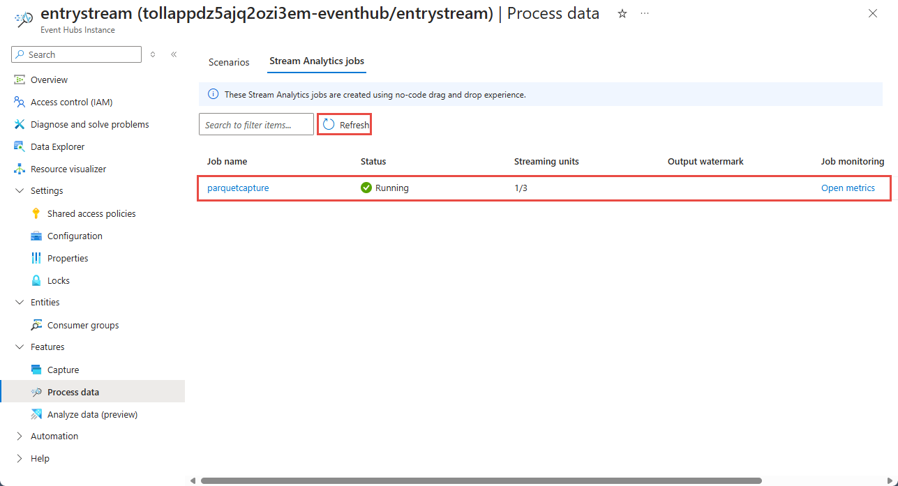 You'll then see a list of all Stream Analytics jobs created using the no code editor. And within two minutes, your job will go to a Running state. Select the Refresh button on the page to see the status changing from Created -> Starting -> Running.