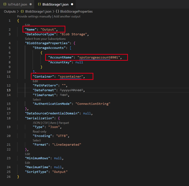 - In the JSON editor for Output.json, choose Select from your subscriptions, and then select your Azure subscription that has the Azure Storage account.
