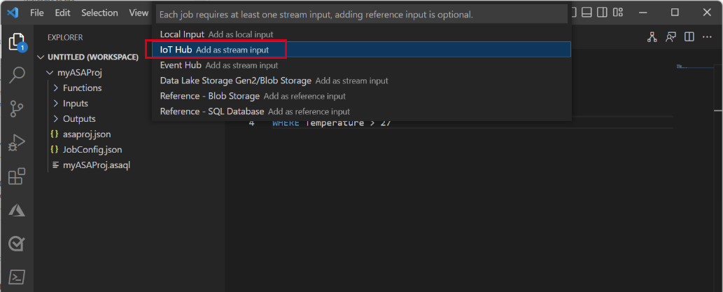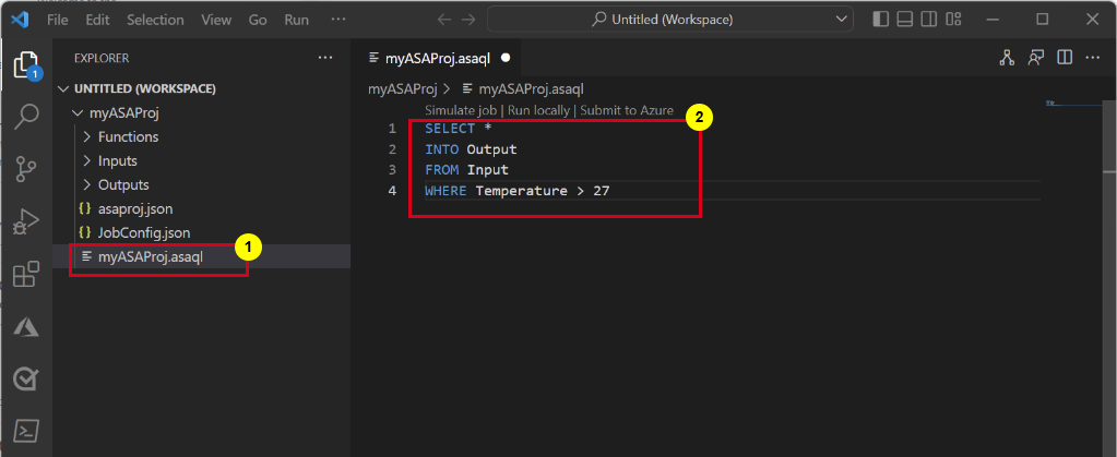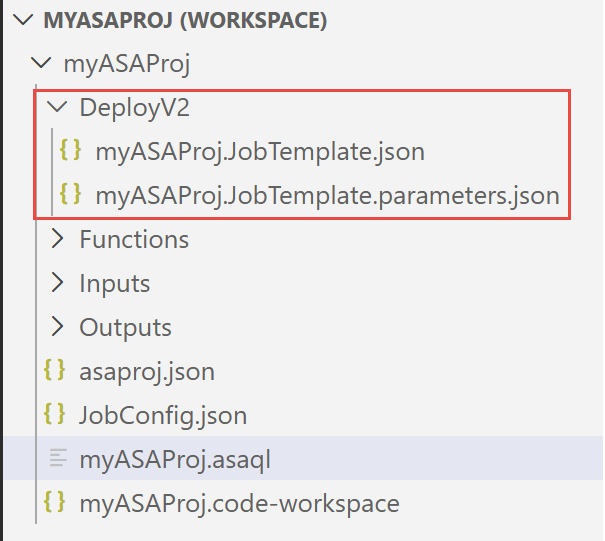 Visual Studio Code adds an ASA project to your workspace. It consists of three folders: Inputs, Outputs, and Functions. It also has the query script (*.asaql), a JobConfig.json file, and an asaproj.json configuration file.