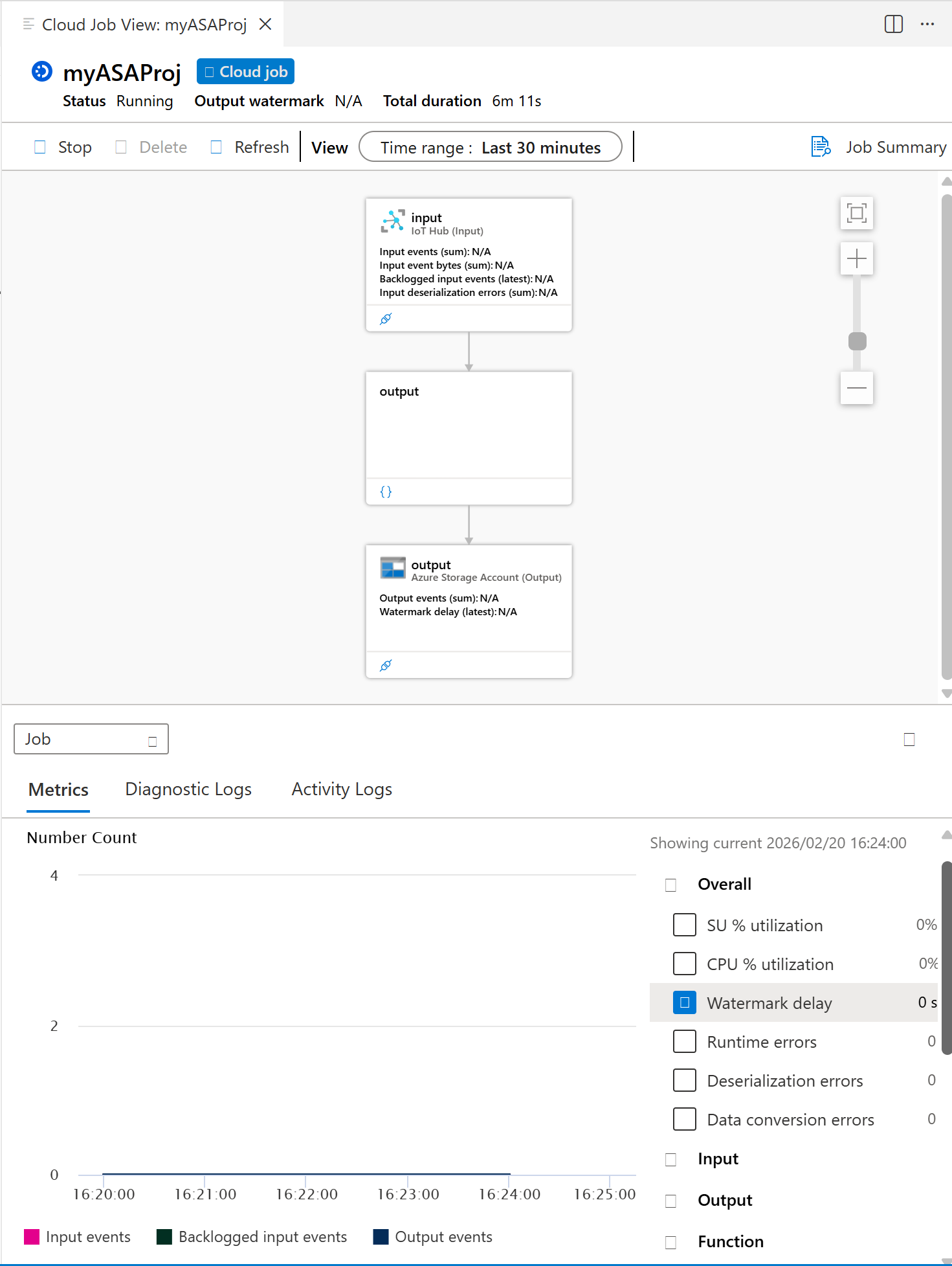 If your job starts successfully, the job status changes to Running. You see a logical diagram showing how your ASA job is running.