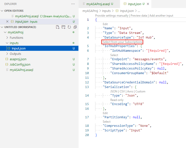When you add inputs and outputs from the command palette, the corresponding paths are added to asaproj.json automatically. If you add or remove inputs or outputs on disk directly, you need to manually add or remove them from asaproj.json. You can put the inputs and outputs in one place and then reference them in different jobs by specifying the paths in each asaproj.json file.