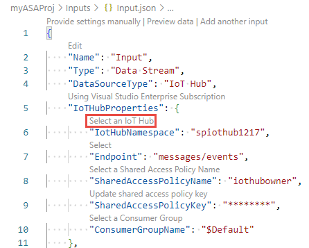 SharedAccessPolicyKeyvalue should be automatically set.Select Preview data to see if the input data is successfully configured for your job. It will fetch a sample of your IoT Hub and show in the preview window.