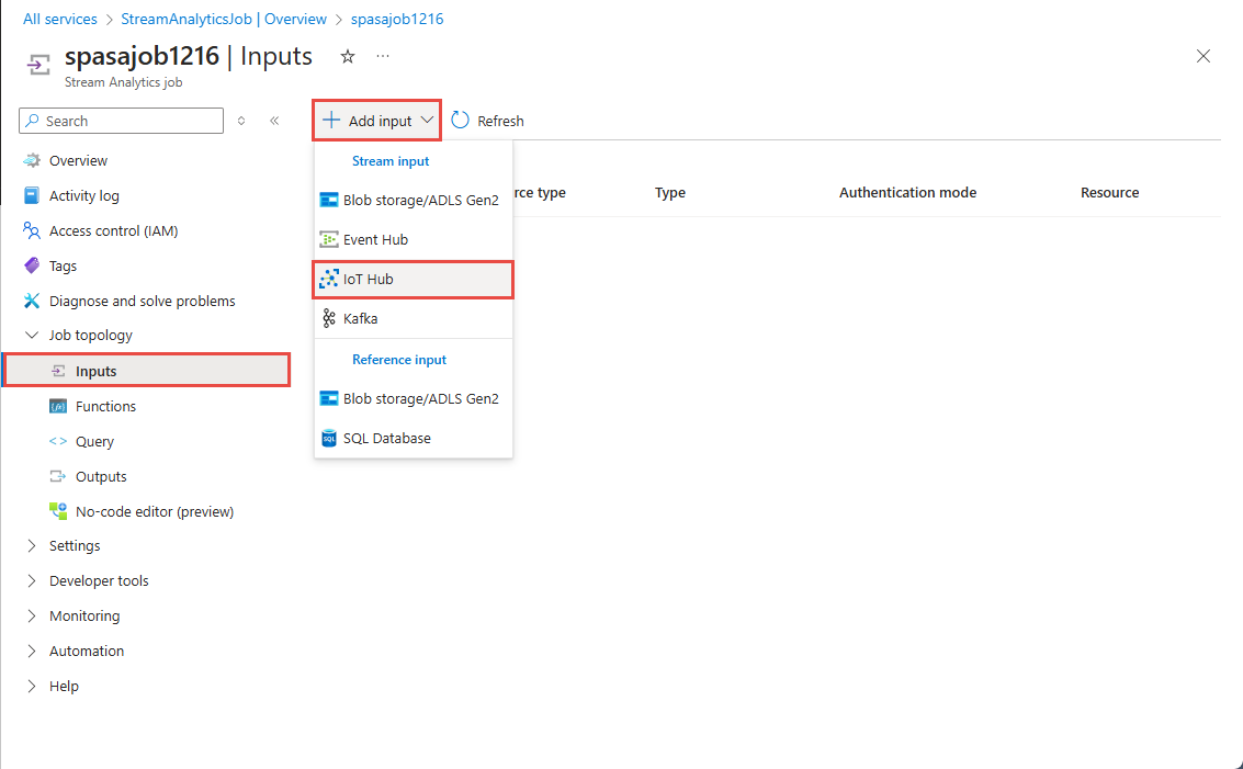 On the Stream Analytics job page, select Inputs under Job topology on the left menu.