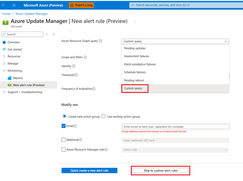 2. Select Skip to custom alert rules to go directly to the alert rule creation flow, where you can configure advanced alert rule settings.